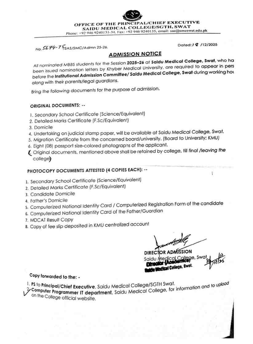 Admission notice for all nominated MBBS Students for the Session 2025-26 at Saidu Medical College....