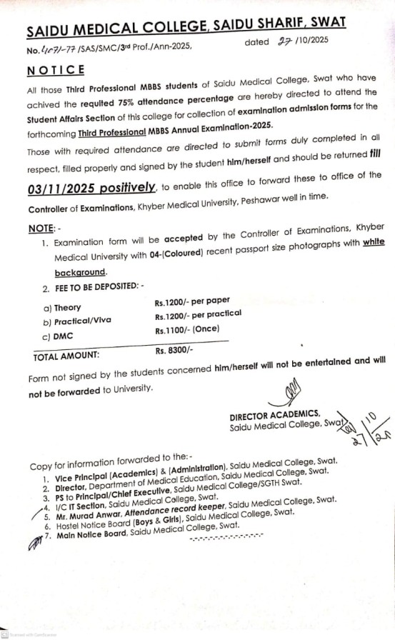 4th Professional MBBS students of SMC Swat are informed to attend SAS for Collection examination admission forms for the upcoming Annual Examination 2021 immediately. Forms duly completed, filled properly and should return till 18/11/2021 positively. (03/11/2021)